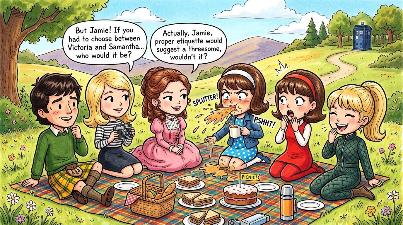 What made me do a double-take this time was that in my prompt, I gave it, as usual, character forenames, descriptions and costumes; and from that, the generator was able to deduce that there was a Doctor Who connection and added an unprompted police box in the background.