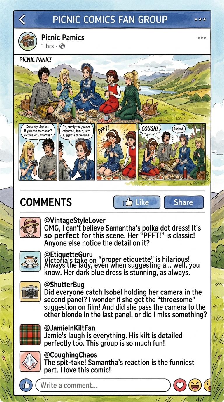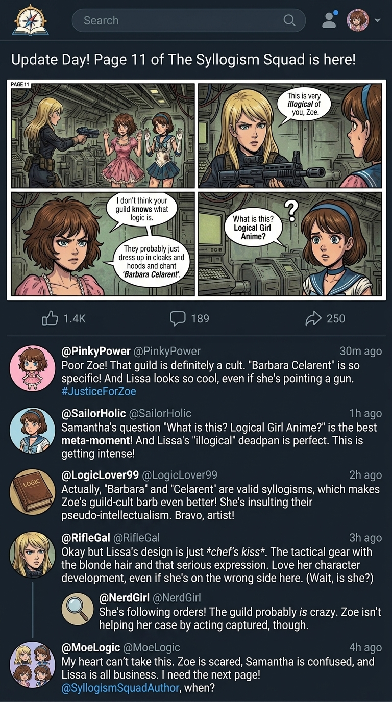 It's also possible to feed Nano Banana 2 an image and have it simulate people commenting on it, just in case one's ego is fragile enough to be flattered by fake reviews of one's fake fanart. (I was impressed that it understood the dialogue enough to follow Zoë's "Barbara Celarent" jibe). What's amusing is that when you do it with an image that it's generated itself, the comments sometimes point out mistakes (such as Isobel's camera suddenly teleporting to Gia). Which is all very well, but if the generator's got enough smarts to spot that something's wrong, it would would have been better to use them when generating the image in the first place. | |